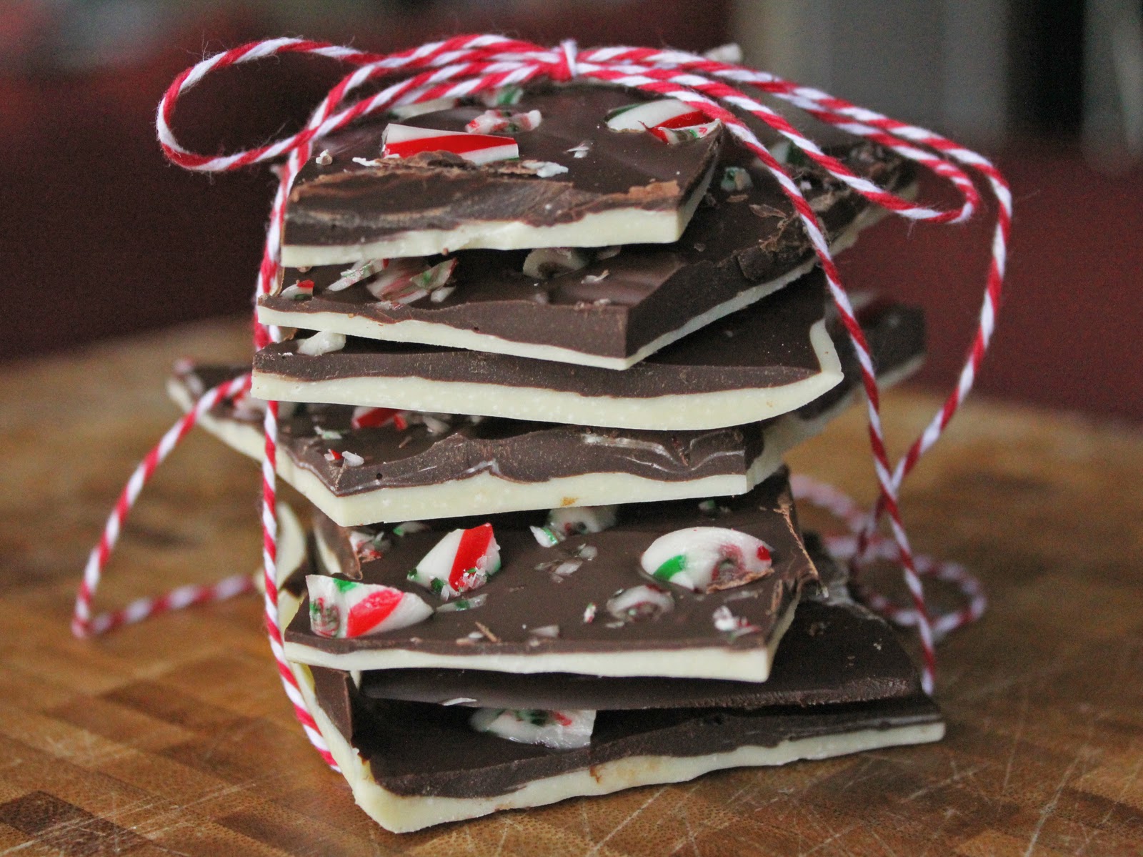 You need two double boilers! In one double boiler, melt dark chocolate and in the other one melt white chocolate over medium-low heat. Stir in peppermint and orange extracts as the dark chocolate melts (removed from heat). Pour dark chocolate onto baking sheet. Pour melted white chocolate on top in a zigzag pattern, use a toothpick to swirl together. Sprinkle peppermint candies and orange peel. Freeze until firm. Break bark into pieces. Voila!
